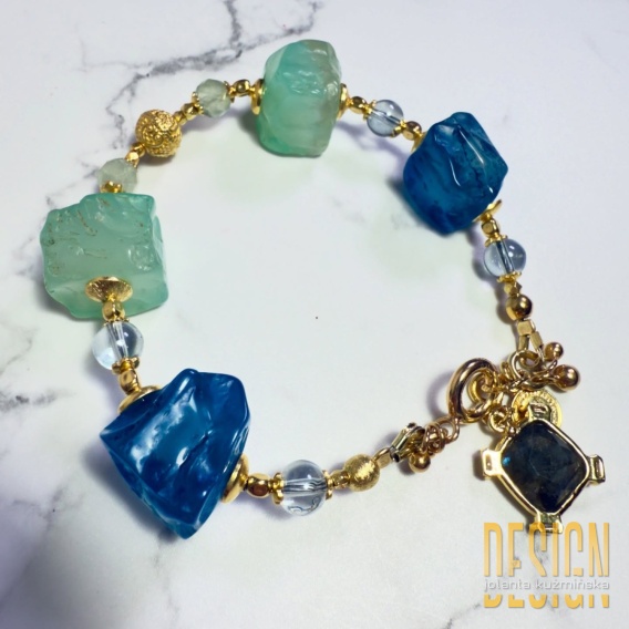 Fluoryty w niezwykłych, nasyconych odcieniach zieleni i głębokiego błękitu tworzą bransoletkę, obok której nie da się przejść obojętnie. Akcenty akwamarynu i frenitu dodają jej lekkości, a całość dopełnia charm z labradorytem – z tajemniczą, migoczącą poświatą.