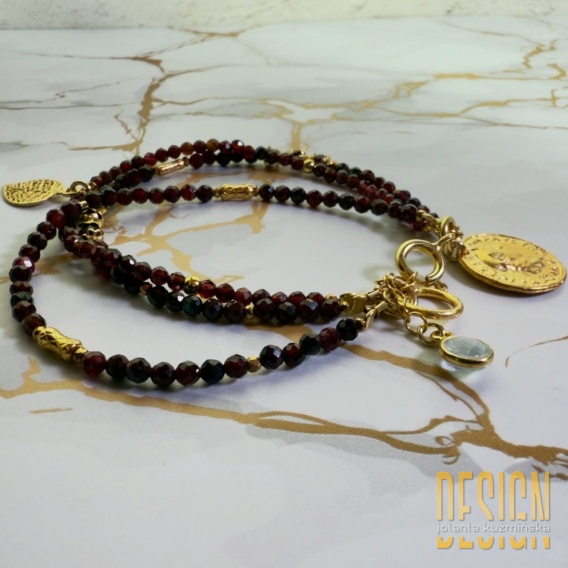 Bransoletka z granatów almandynów – 3-rzędowa z zawieszką monety i złoconym srebrem