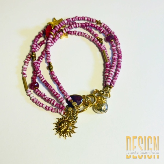 Wyjątkowa, ręcznie wykonana bransoletka z czterech sznurów barwionych agatów w odcieniach różu, bordo i fioletu, wzbogacona detalami ze srebra pozłacanego 24-karatowym złotem. Całość uzupełniają symboliczne zawieszki – gwiazda, krzyż, motyl – które nadają bransoletce indywidualny charakter.