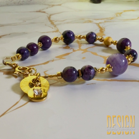 Elegancka bransoletka wykonana z naturalnych, fioletowych kamieni czaroitu, zachwyca głębią barwy i unikatowym rysunkiem każdego kamienia. Całość uzupełniają detale ze srebra próby 925 pozłacanego 24k złotem, które nadają bransoletce luksusowego charakteru i subtelnego blasku.