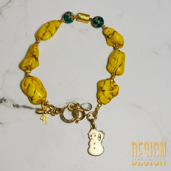 Wyrazisty howlit o niezwykłej, złotej barwie przyciąga spojrzenia i nadaje całości artystycznego, niepowtarzalnego wyrazu. Każdy kamień ma unikalny rysunek, dzięki czemu ta bransoletka jest absolutnie jedyna w swoim rodzaju.