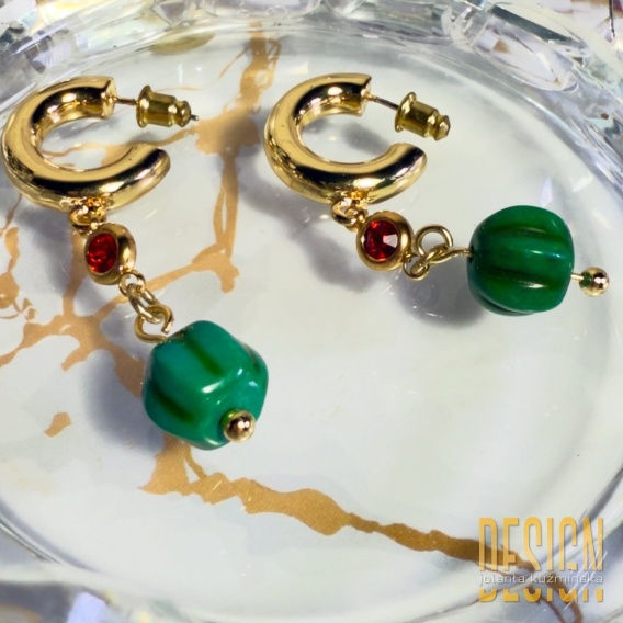 Kolczyki z zielonym malachitem i czerwonym kryształkiem – pozłacane detale | Kuźmińska Design