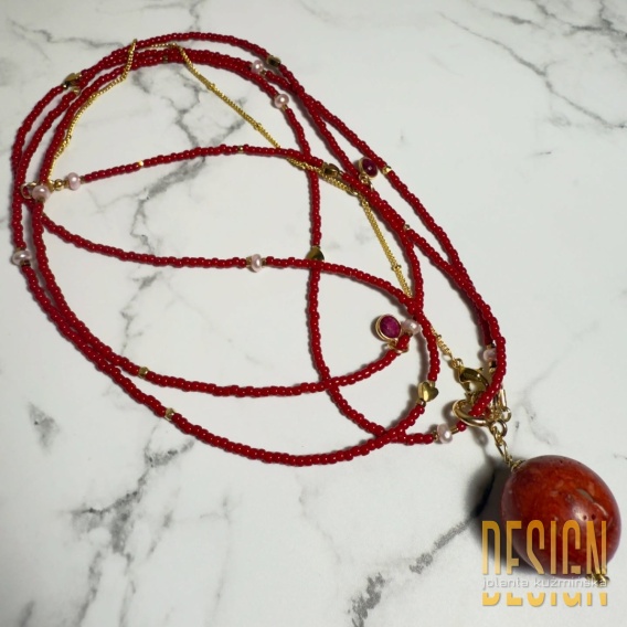Naszyjnik został wykonany z drobnych czerwonych koralików typu toho, dodatkowo wzbogaconych o subtelne akcenty różowej perły naturalnej oraz złocone detale, które dodają całości elegancji i wyrafinowania.