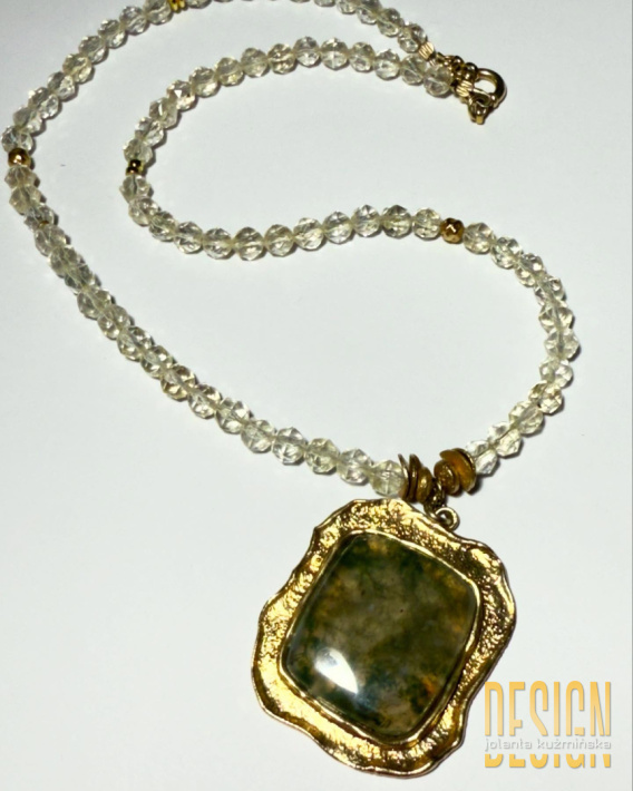 Elegancki i pełen blasku naszyjnik wykonany z naturalnych cytrynów o ciepłej, złocistej barwie. Kamienie zostały starannie oszlifowane, aby podkreślić ich subtelny połysk i szlachetny charakter. Główną ozdobą jest unikatowa zawieszka z labradorytu, osadzona w srebrze utwardzonym i pokrytym 24-karatowym złotem. Efekt labradoryzacji nadaje zawieszce wyjątkowy, tajemniczy połysk, mieniący się odcieniami niebieskiego, szarości i złota.