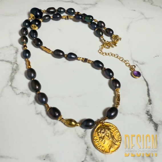 Centralnym elementem projektu jest zawieszka stylizowana na antyczną monetę, misternie zdobiona i oprawiona w srebro próby 925 złocone 24k złotem. Motyw antyczny nadaje naszyjnikowi szlachetności i ponadczasowej elegancji.