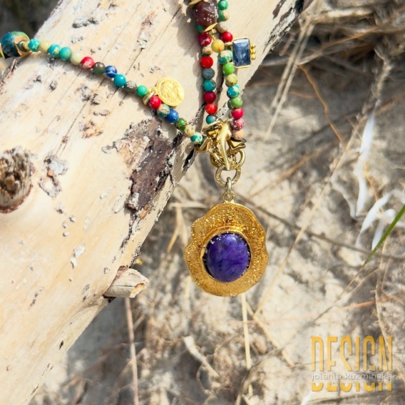 Wyjątkowy naszyjnik z naturalnych jaspisów full kolor, których barwna paleta przywołuje energię lata, swobodę i artystyczny styl boho. Centralnym punktem projektu jest spektakularna zawieszka z czaroitu — kamienia znanego z niezwykłej struktury i głębokiej fioletowej barwy.