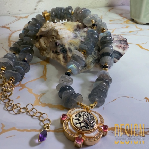 Wyjątkowy, unikatowy naszyjnik z naturalnych labradorytów, stworzony w jednym egzemplarzu. Kompozycja inspirowana antycznym pięknem i symboliką starożytnej Grecji łączy w sobie siłę kamieni, historię oraz luksusowe wykończenie.