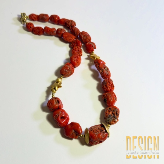 Wyjątkowy naszyjnik z naturalnego, surowego korala w intensywnej czerwieni. Każdy koralik ma niepowtarzalną strukturę i kształt, dzięki czemu całość zachwyca organicznym, lekko artystycznym charakterem. Centralnym akcentem kompozycji jest efektowny motyw rozgwiazdy, który przywodzi na myśl morze, wakacje i wolność.
