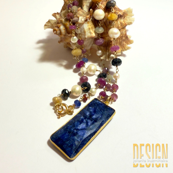 Ekskluzywny naszyjnik z kolorowych szafirów, pereł i lapis lazuli – srebro złocone 24k