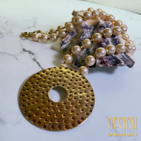 Centralnym elementem naszyjnika jest efektowna zawieszka o średnicy 5 cm, wykonana ze srebra utwardzonego i pokrytego złotem. Jej strukturalna powierzchnia subtelnie odbija światło, tworząc elegancki, biżuteryjny akcent widoczny z daleka, a jednocześnie niezwykle harmonijny.