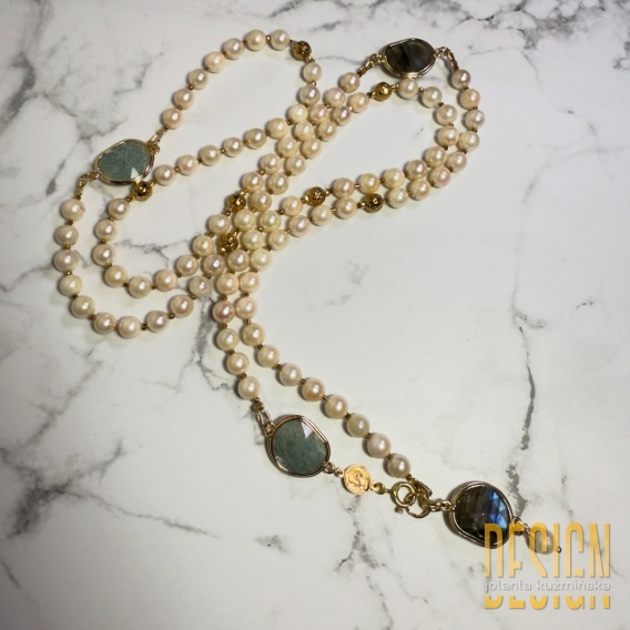 Naszyjnik z porcelanowych pereł połączonych z fasetowanymi labradorytami i akwamarynem to wyjątkowa propozycja z kolekcji Kuźmińska Design. Delikatna poświata pereł i iryzacja labradorytu tworzą szlachetne i nowoczesne połączenie.