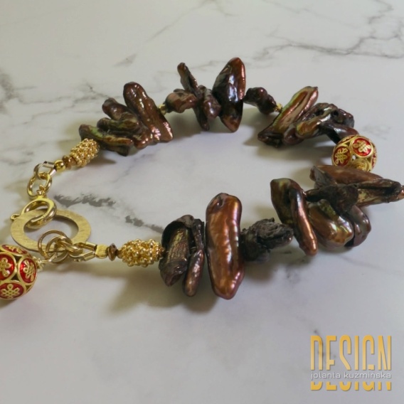 Bransoletka została wzbogacona o dekoracyjne, emaliowane kulki typu rolled gold, które pięknie kontrastują z organiczną formą pereł Biwa i nadają projektowi wyjątkowego charakteru. Wszystkie metalowe elementy wykonano ze srebra w złoceniu 24-karatowym złotem.